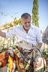 Settled in Arles since 2017, he embroiders 19th-century hemp canvases on his knees, without any preliminary sketch but with writing as the starting point for the stories he will soon tell in tapestry. His thread, according to Christian Lacroix, ‘alternates between gouache, watercolour, glaze, thick oil and charcoal, scarifying the canvas, revealing day after day, month after month [...] processions, exiles, frightened architecture, poets on stretchers, artists getting off their beds, boats for prophets and popes failing under the weight of flowers’.